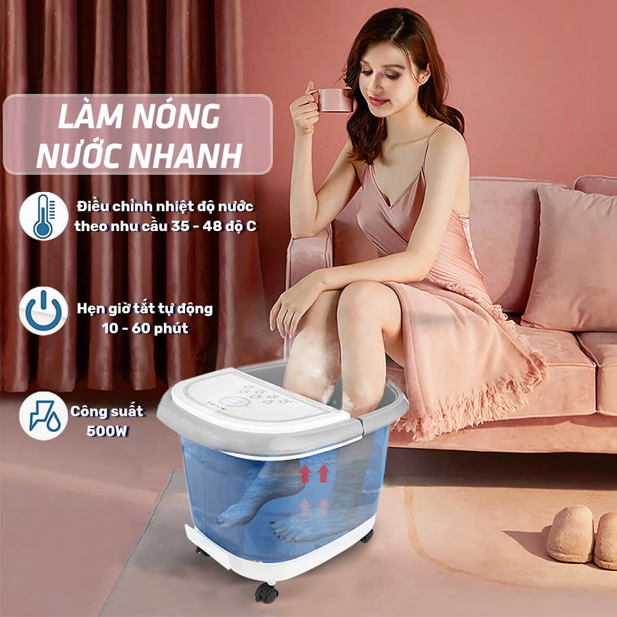Tích hợp 6 con lăn massage với 2 kiểu dáng khác nhau, tích hợp dưới đáy bồn để matxa bấm huyệt cho lòng bàn chân. Con lăn tự động massage không phải dùng đến lực như các loại bồn ngâm chân trước đây. Các con lăn được bố trí tương ứng với vị trí ngón chân, lòng bàn chân, gót chân cho cảm giác được xoa bóp, thư giãn chuyên sâu, xua tan mọi đau nhức mệt mỏi.
